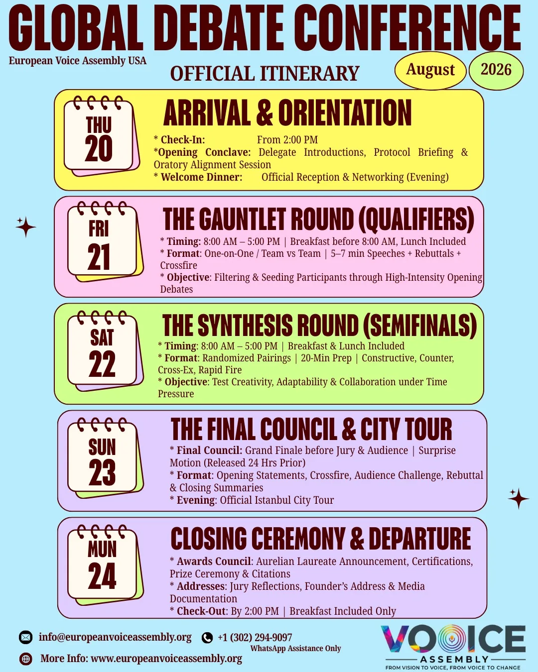 - Funding: Fully funded by European Voice Assembly, USA