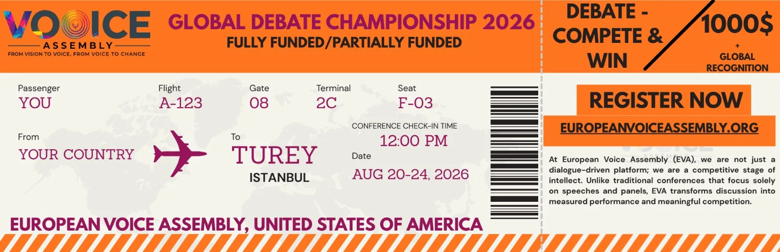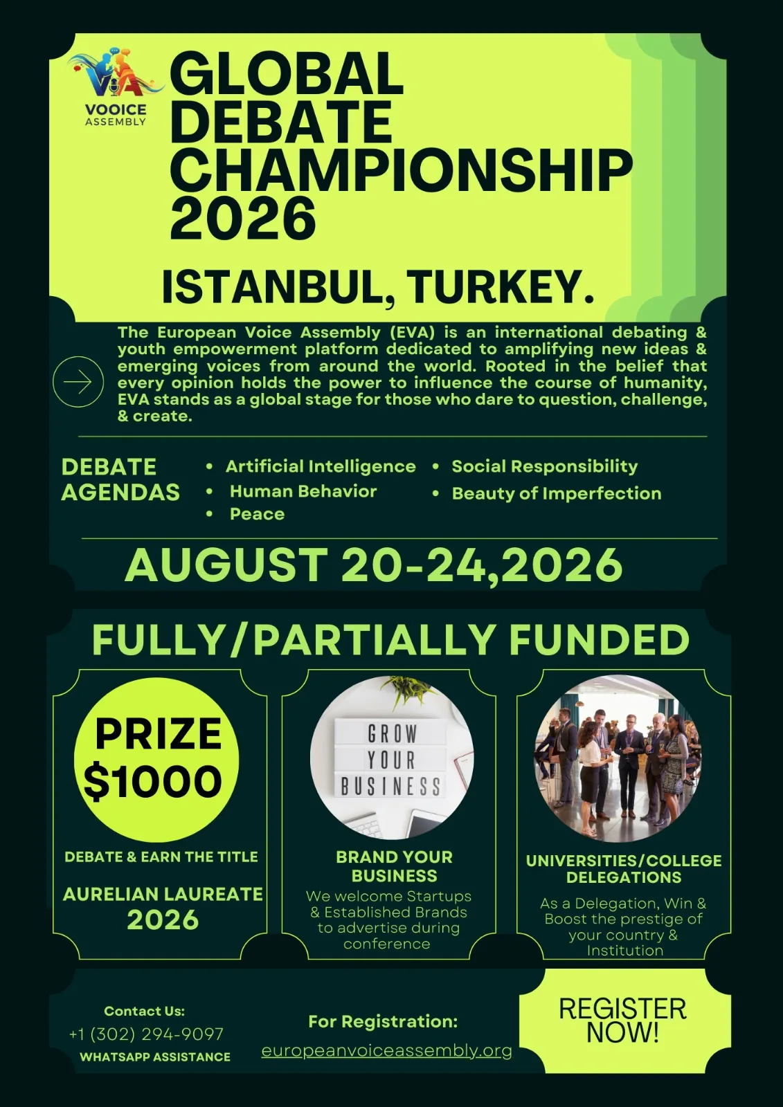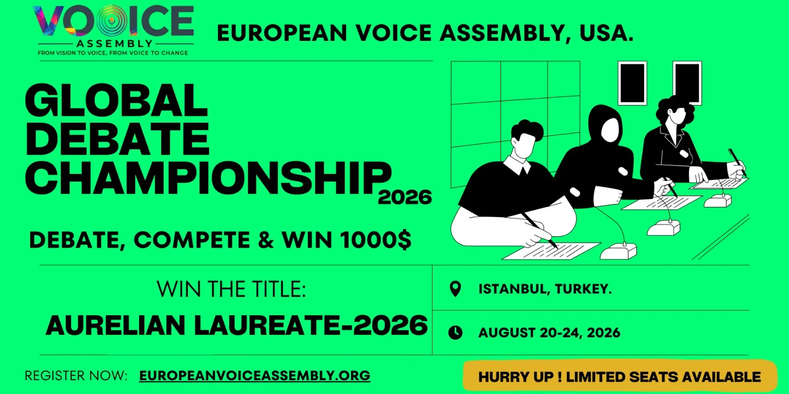 Are you ready to be part of the most prestigious, fully funded international debating conference in the world? Applications are now open for the Global Debate Championship–European Voice Assembly (EVA) Turkey 2026! This 5-day international conference invites participants from all around the globe to compete for the ultimate honor: the title of Aurelian Laureate 2026. The European Voice Assembly (EVA) brings together young leaders, visionaries, and thinkers from every continent to engage in meaningful dialogue. Applicants aged 16-40 years from all disciplines can benefit from this brilliant opportunity. Below are more details about the requirements and the application process.